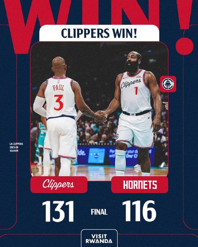 末节比赛,哈登连续两节单节轰下30+得分,也是本场第二次单节轰下35+得分,快船继续内外开花扩大108-87领先21分优势。快船多点开花持续压制黄蜂,并在之后扩大131-107领先24分优势提前奠定胜局。黄蜂最后时刻一波9-0攻势追分,但已经无力改变局势,最终快船131-116战胜黄蜂结束3连败。